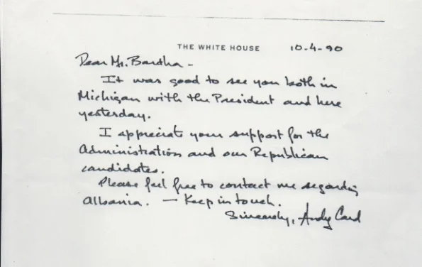 On November 14, 1990, Andrew Card, who would later serve as White House Chief of Staff under President George W. Bush, met with Robert Hodgkins, Ekrem Bardha, and Sami Repishti to discuss the situation in Kosova. This letter was sent to Ekrem following their meeting, reflecting the significance of their efforts and conversations regarding the region.