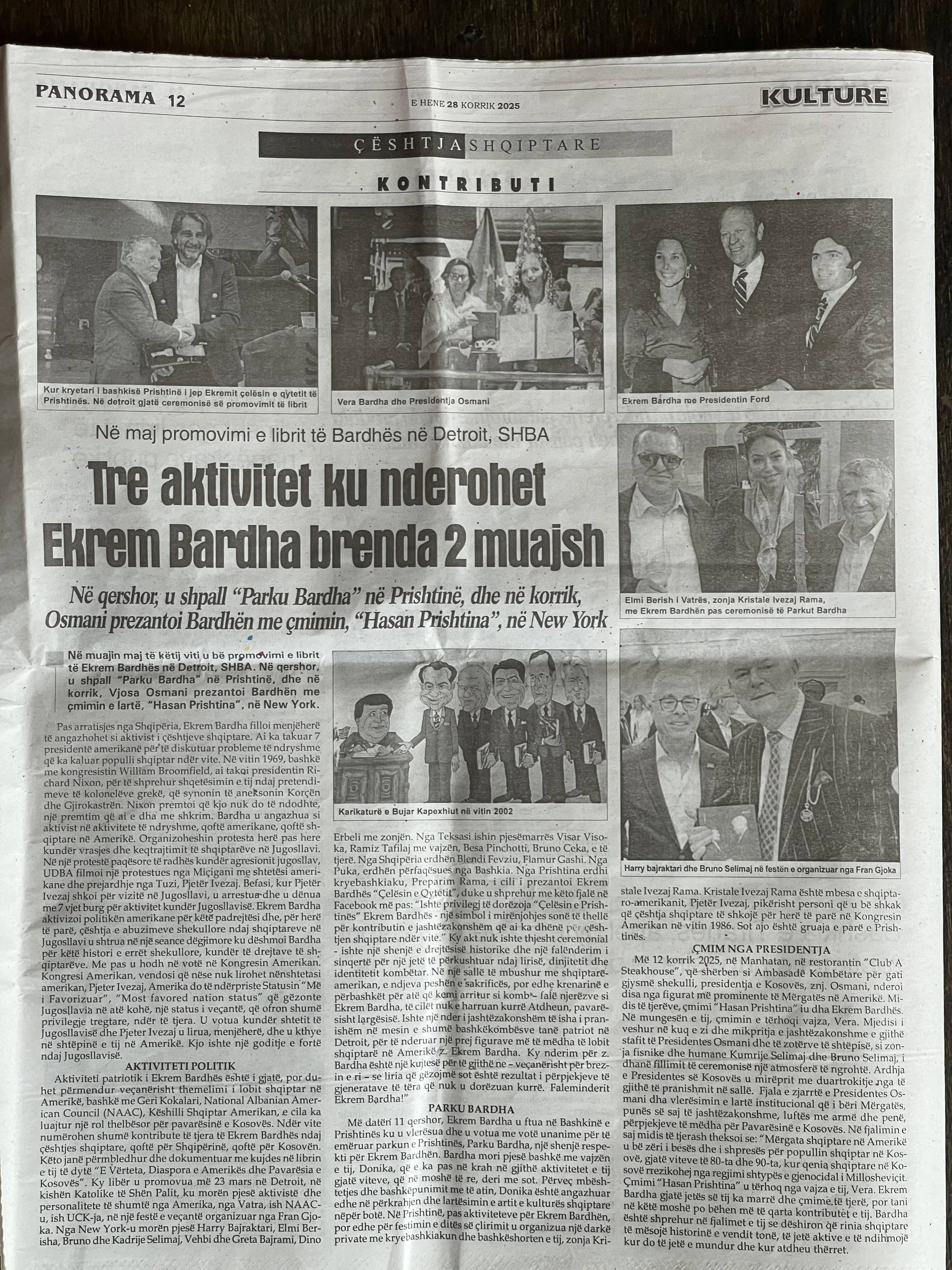 On July 28, 2025, Albania’s largest newspaper Panorama published a two-page feature celebrating Ekrem Bardha’s lifelong contributions to the Albanian and Kosovar causes. The article highlighted his historic meetings with seven U.S. presidents, his decades of political advocacy, and his recent honors—including the dedication of “Parku Bardha” in Prishtina, the launch of his memoir in Detroit, and his receipt of the prestigious “Hasan Prishtina” Order from President Vjosa Osmani. This feature marked a moment of national recognition, showcasing Bardha’s enduring legacy as a leader, philanthropist, and advocate for Albanian identity worldwide.